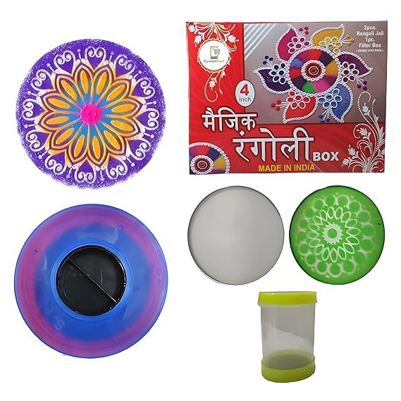 - Complete Kit: The package includes four Rangoli Pouches (4x100 grams), four Stencils (10cm Radius), and one Magic Rangoli Maker for easy, intricate designs.